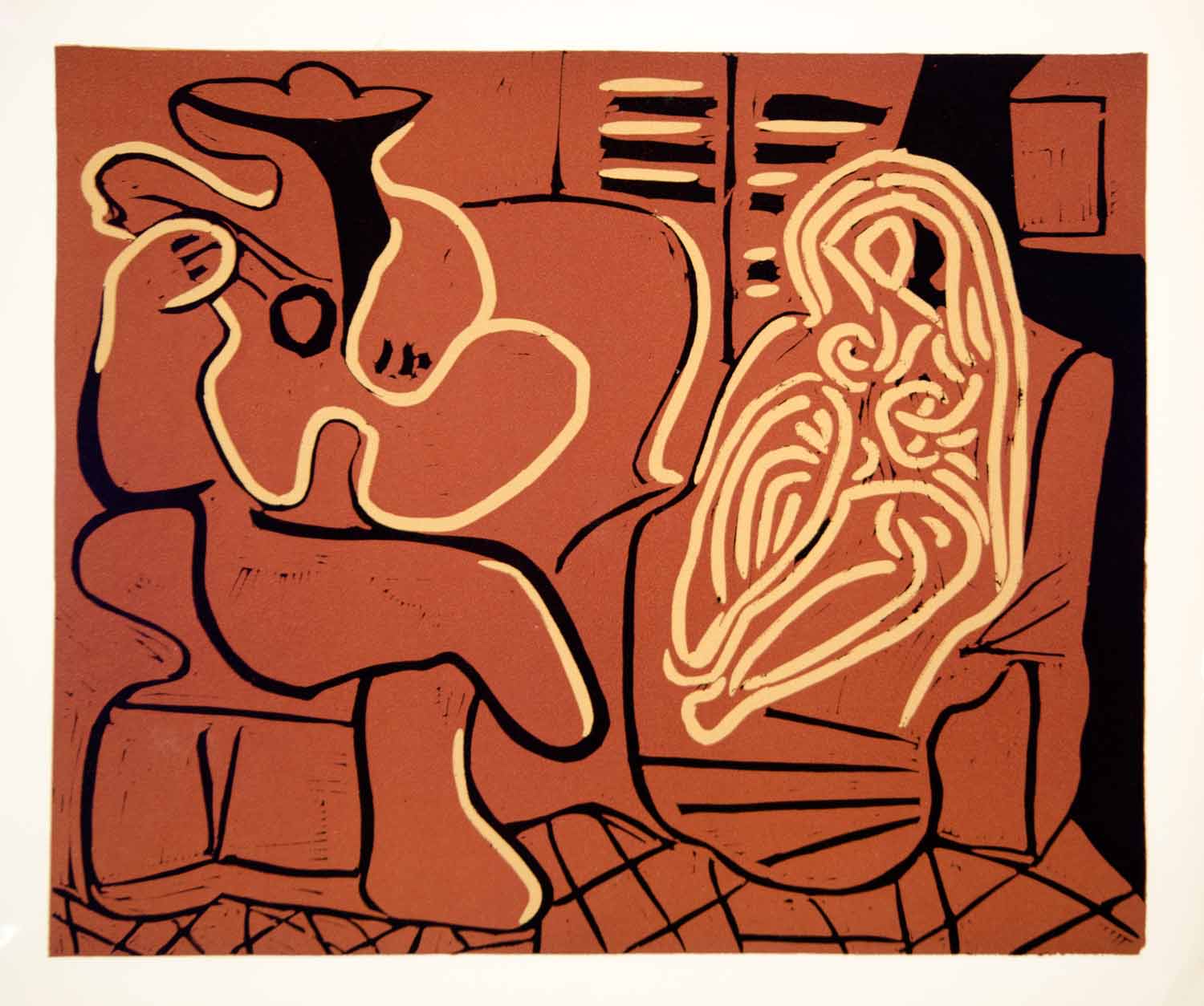 This is an original 1963 color lithograph of the original linocut by Pablo Picasso, created with one block: ocher, brown, black. Limited Edition, unnumbered and unsigned.