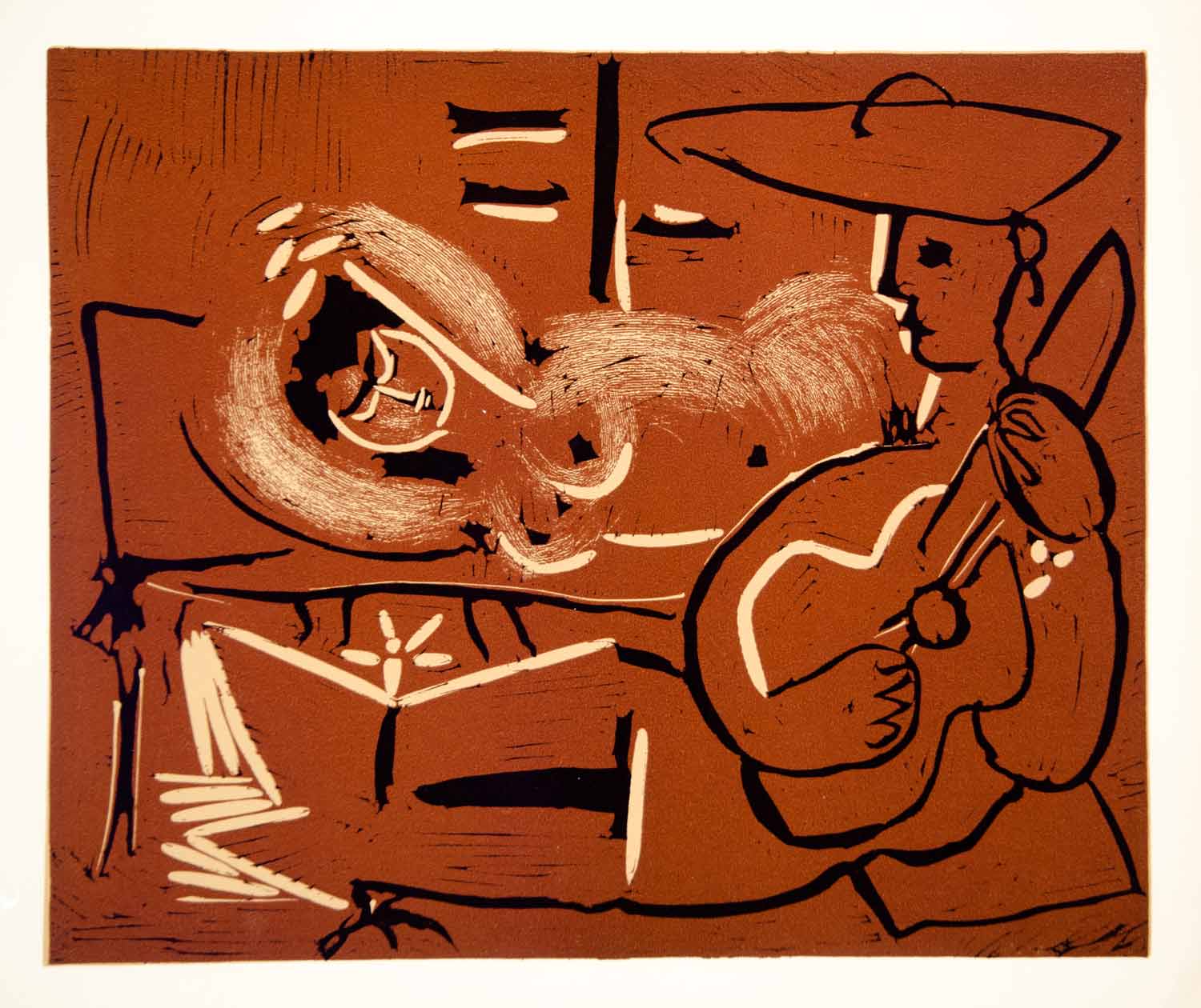 1963 Lithograph Picasso Nude Reclining Woman Picador Playing Guitar Linocut Art