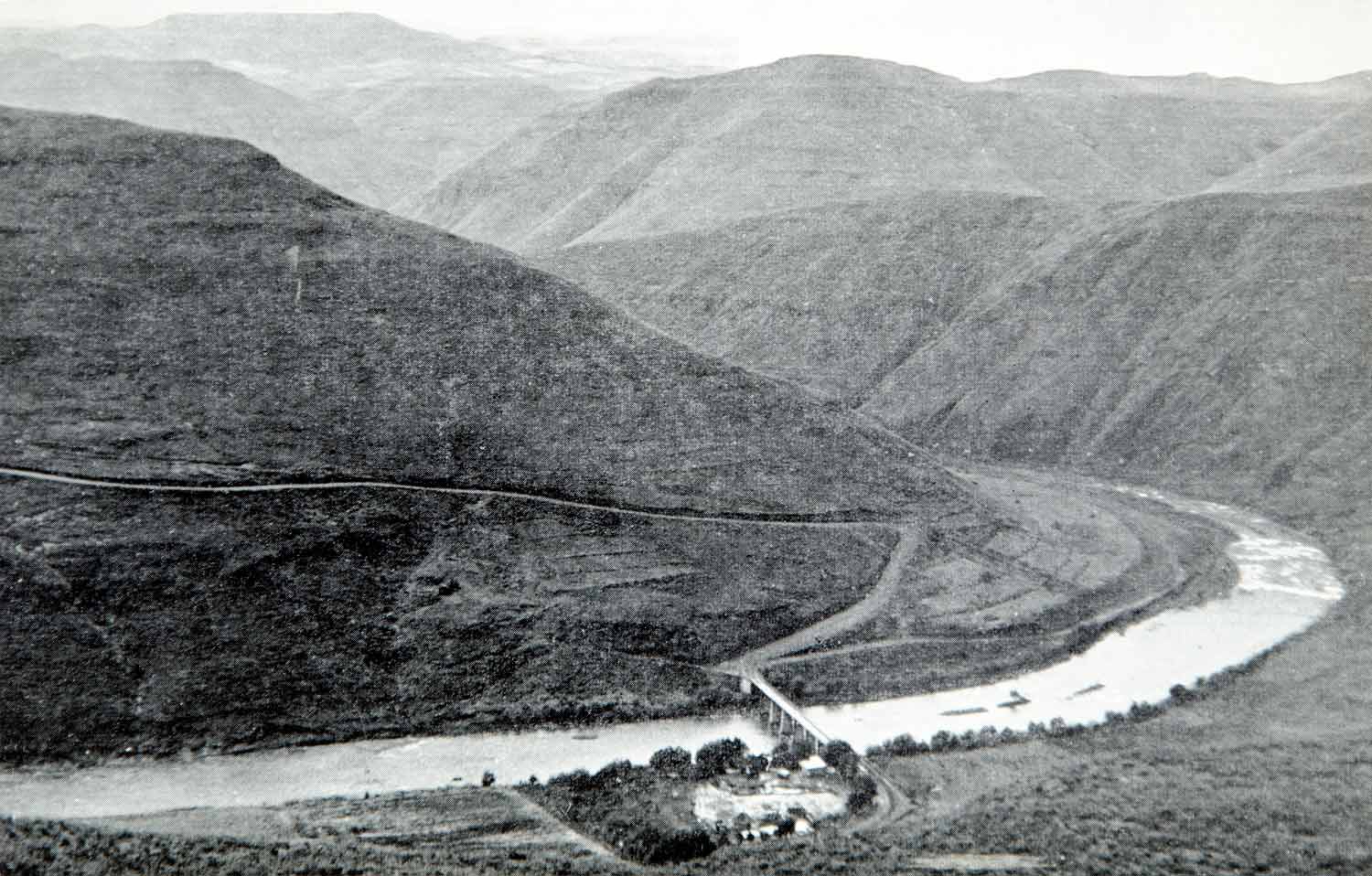 This is an original 1963 black and white halftone print of the bridge that spans the Senqunyane River in the Maluti Mountains in Lesotho, (formerly Basutoland), Africa.