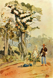 This is an original watercolor print from Eduardo (Edward) Mark titled " Arbol de Bosque Andino Nebuloso" translated as "Tree in the Misty Andean Forest". Here, Mark depicts three people from the mountainous Andean region of Colombia. In the Quindio mountains a woman sits resting on the road while two barefooted men talk. The tall tree behind them is host to parasitic lichens, bromeliads and orchids. In the upper right corner Mark writes: "Paramo del Quindio, Nov. 1st 1847".