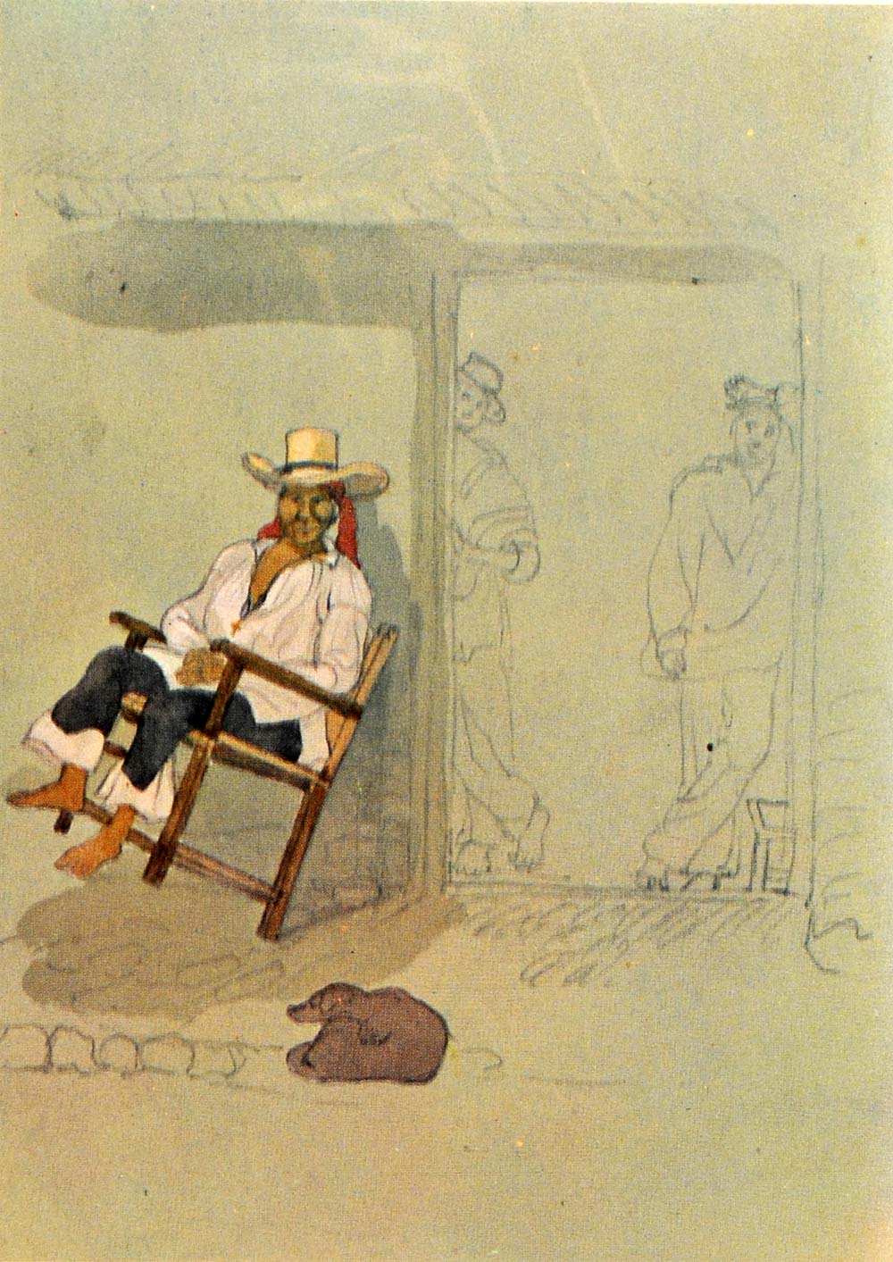 This is an original watercolor print from Eduardo (Edward) Mark titled "Tipos Populares de Peladeros" translated as "Common people from Peladeros". Sketched in Peladeros, the print shows an older man wearing a hat, a white shirt, and a crucifix. He leans his chair against the entryway of a building while two other men look on and a small dog sleeps curled beside him.