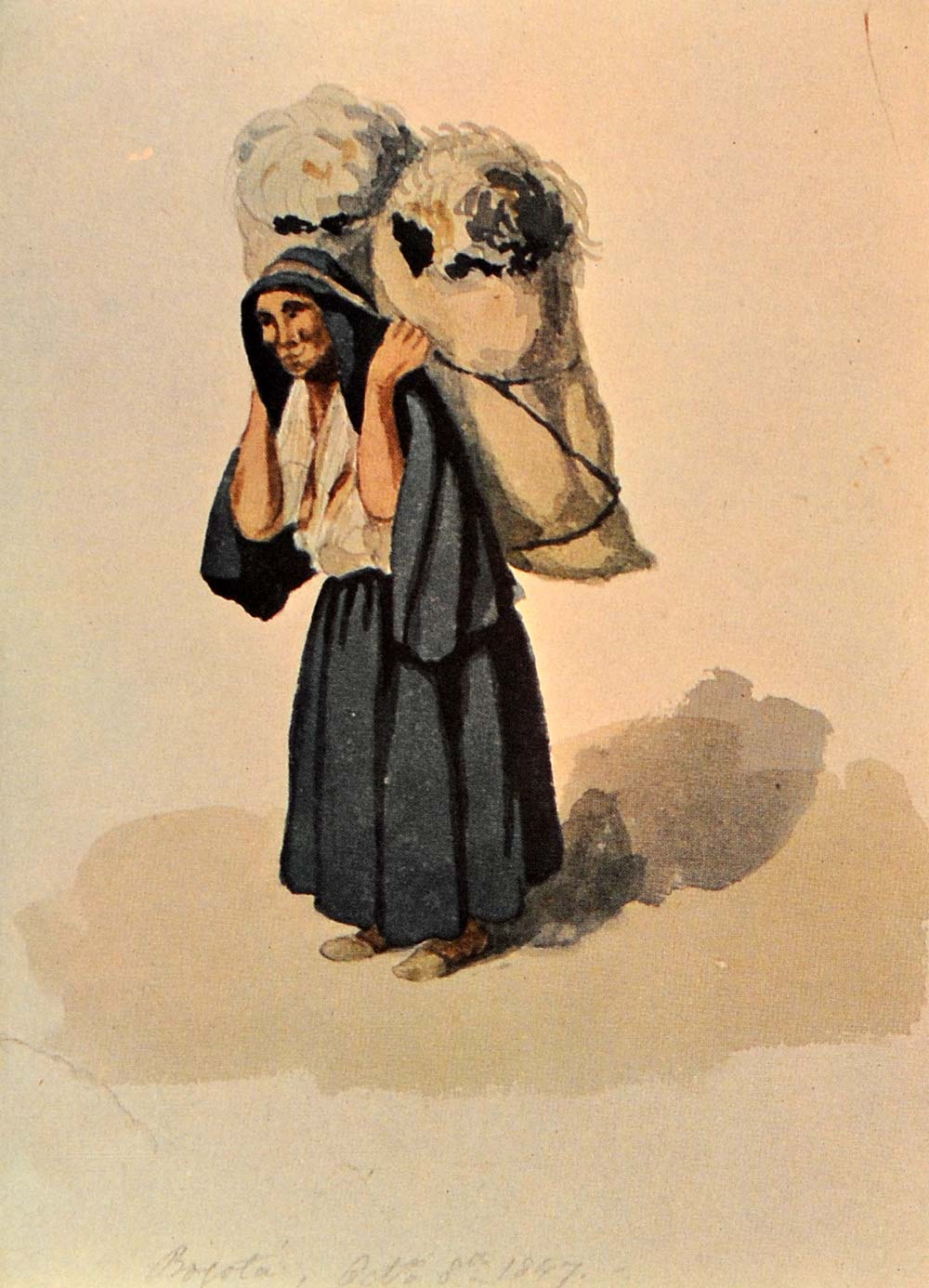 This is an original watercolor print from Eduardo (Edward) Mark titled "Carbonera Indigena" translated as "Indian Woman who sells Coal". In this painting an elderly woman is bent over carrying two large sacks of coal on her back while a strap around her head actually supports the load. Along the bottom Mark writes "Bogota Oct. 8th 1847".