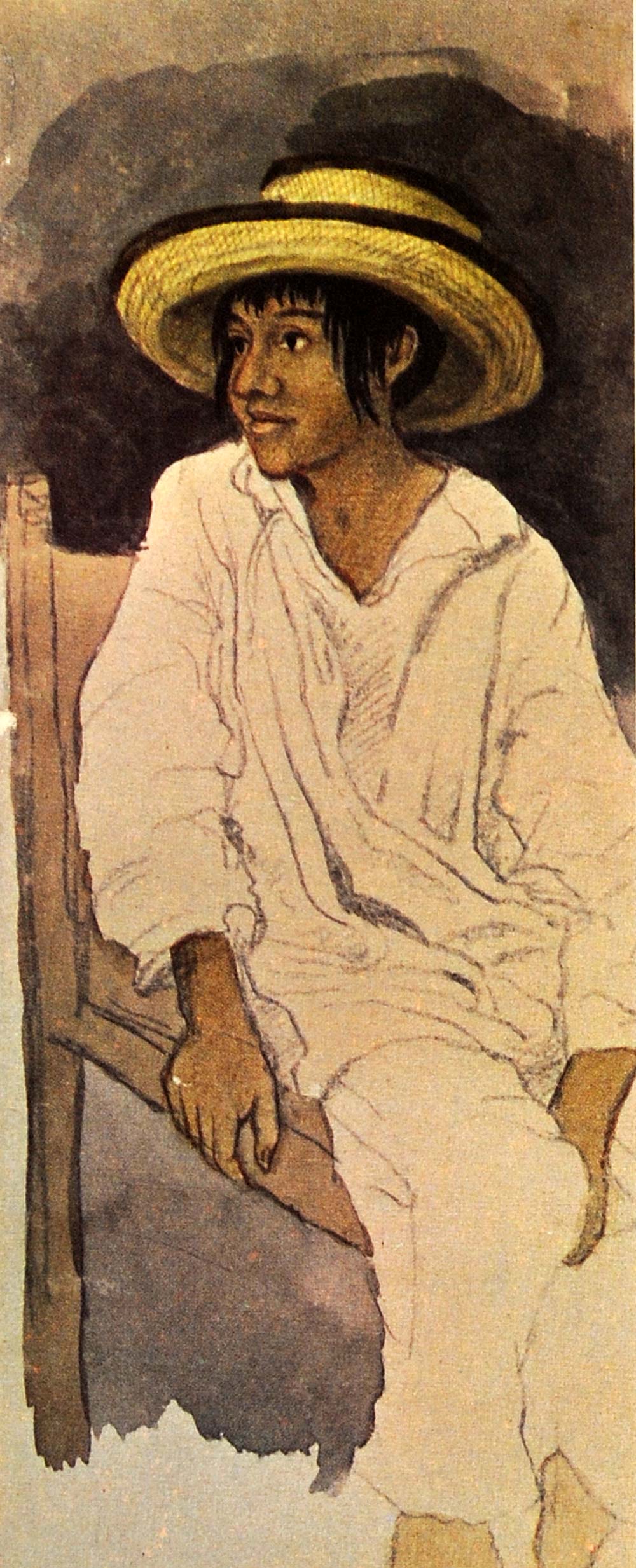 This is an original watercolor print from Eduardo (Edward) Mark titled "Nino Indigeno" translated as " Indian Boy". A young native boy with a slight smile poses on a chair for his portrait. He wears a matching white long-sleeved shirt and pants with a black bordered straw hat.