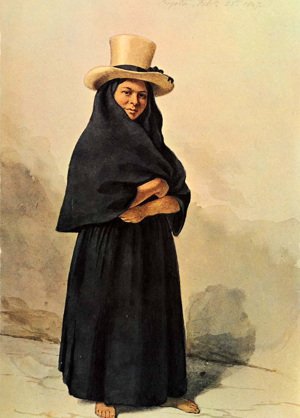 This is an original watercolor print from Eduardo (Edward) Mark titled "Campesina de Choachi" translated as "Peasant Girl from Choachi". A young woman stands barefoot against a building wall with her arms crossed, looking back at the observer. She wears long blue skirts, a matching shawl, and a tall wide brimmed hat. In the upper right corner Mark signed and dated his painting: "Bogota, Feb. 25th 1847".