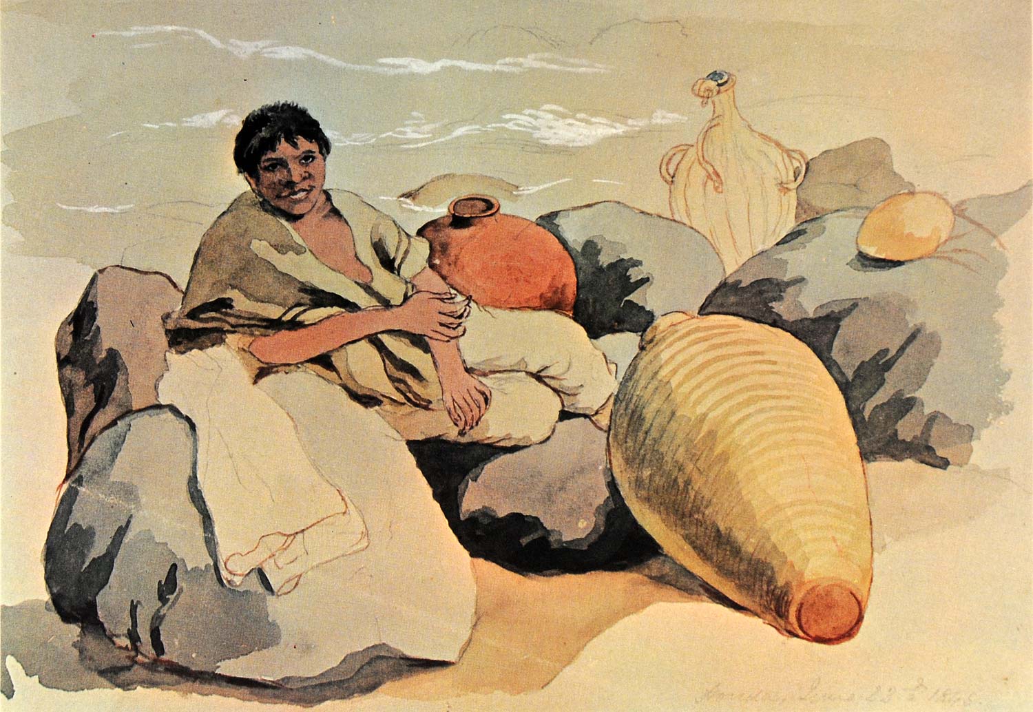 This is an original watercolor print from Eduardo (Edward) Mark titled "Alfarero de Honda" translated as "The Potmaker of Honda". A woman rests among boulders and the large colorful clay pots she made.