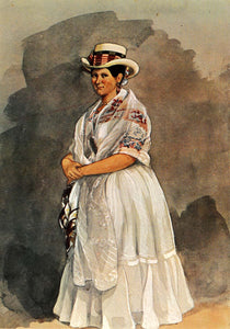 This is an original watercolor print from Eduardo (Edward) Mark titled "Muchacha Guaduera en Traje de Domingo" translated as "Young Lady from Guaduas in her Sunday Dress". A young lady dressed for a Sunday outing stands with her arms crossed, looking back seriously at the observer. She wears long white skirts, a colorful shirt, a lace shawl, earrings and a necklace.