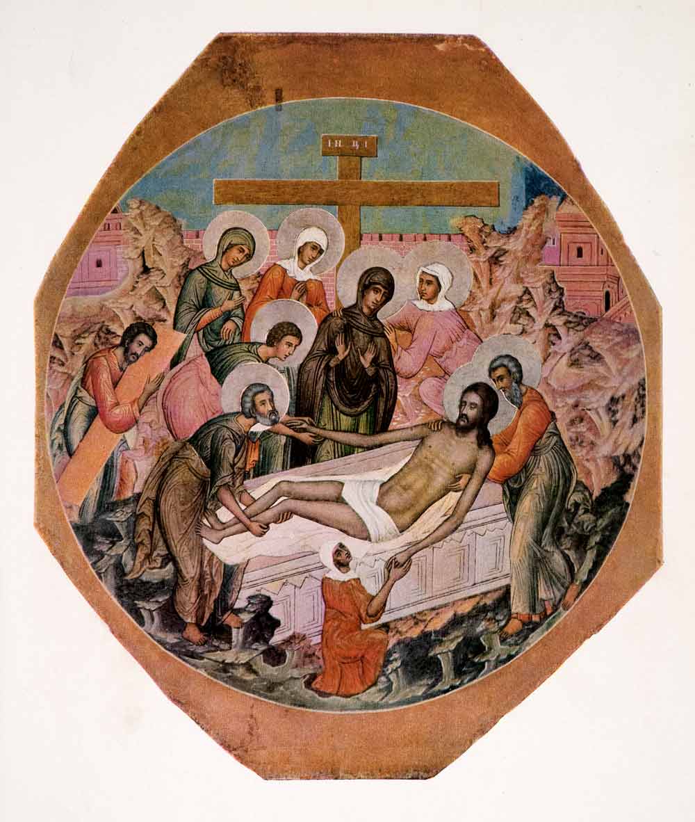 This is an original 1963 color with metallic ink print of the Entombment (Polozenie Vo Grob) located in the State Tretyakov Gallery (Tret'jakov State Gallery), an art gallery in Moscow, Russia.
