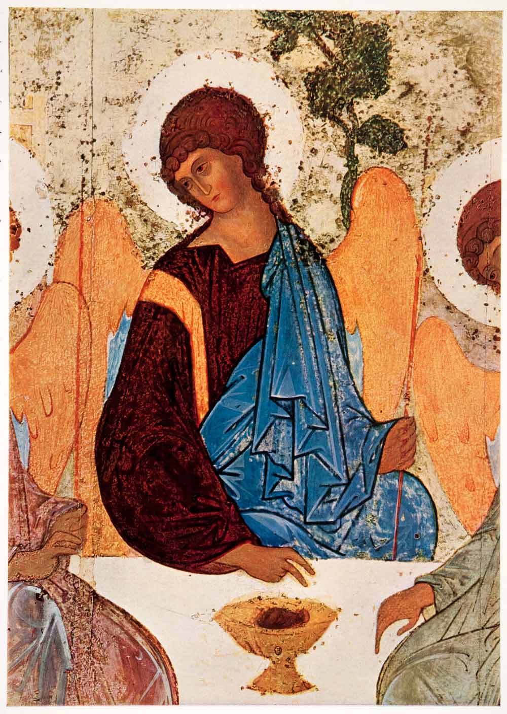 This is an original 1963 color with metallic ink print of Troica, also referred to as The Trinity, featuring God the Son, generally the right angel figure. This print was located in the State Tretyakov Gallery (Tret'jakov State Gallery), an art gallery in Moscow, Russia.