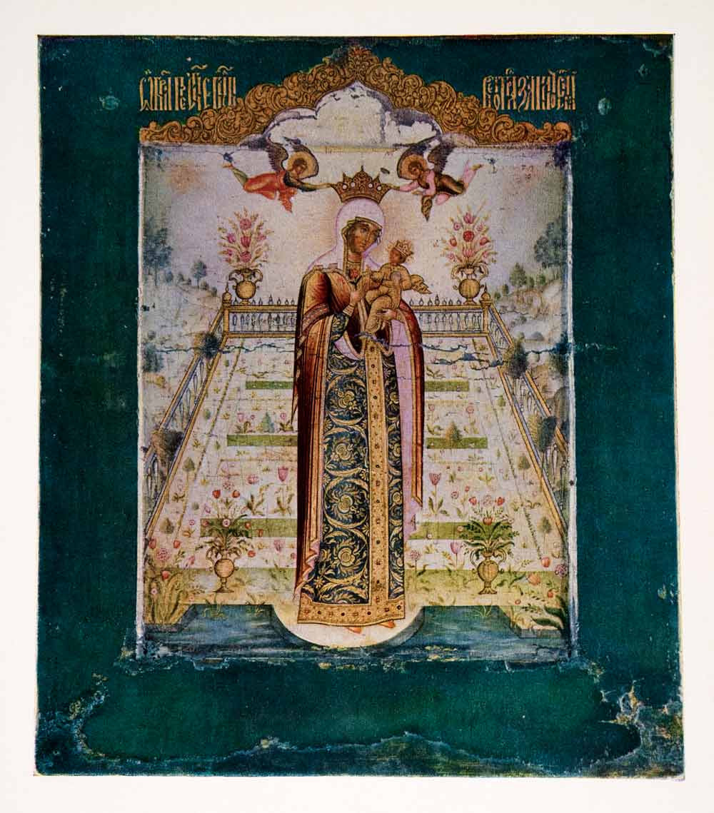 This is an original 1963 color with metallic ink print of the Virgin of the Closed Garden, also known as Bogomater Vertograd Zakljucennyj located in the State Tretyakov Gallery (Tret'jakov State Gallery), an art gallery in Moscow, Russia.