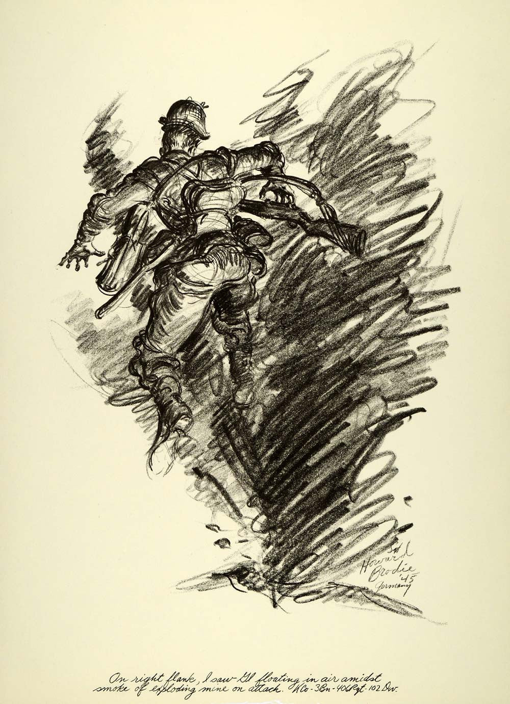 1963 Print Howard Brodie World War II Art GI U.S. Soldier Mine Explosion Germany