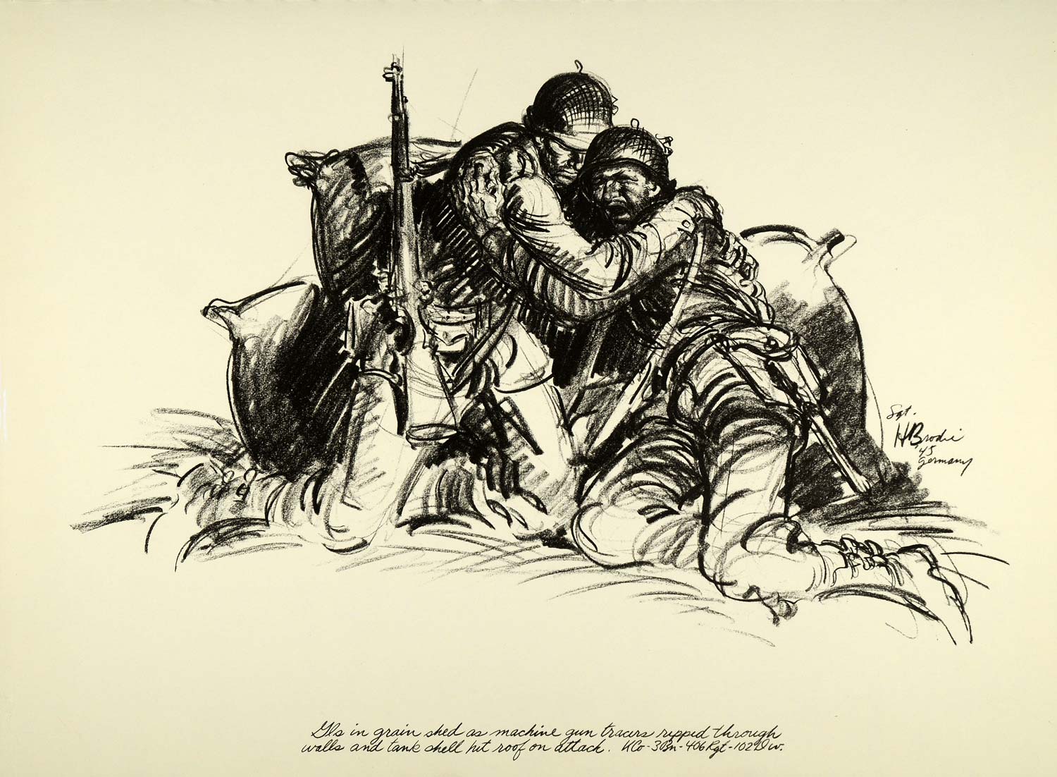 Howard Brodie (1915-2010) was a renowned artist known for his combat sketches and courtroom scenes. Brodie enlisted in the Army in 1942, and recorded the end of the Guadalcanal campaign, as well as the Central Europe and Rhineland campaigns. He never carried a weapon during this time, but was found under fire on various occasions, where he dropped his sketchpad and worked as a medic; for this, he was awarded the Bronze Star of Valor. After the war, he became a courtroom artist and covered several famous trials, including that of Charles Manson, General Westmoreland, Patty Hearst and the Chicago Seven. He remained a war artist during the Korean, French Indochina and Vietnam wars, and established himself as one of the top news artists by capturing emotions with his fluid lines and attention to detail.
