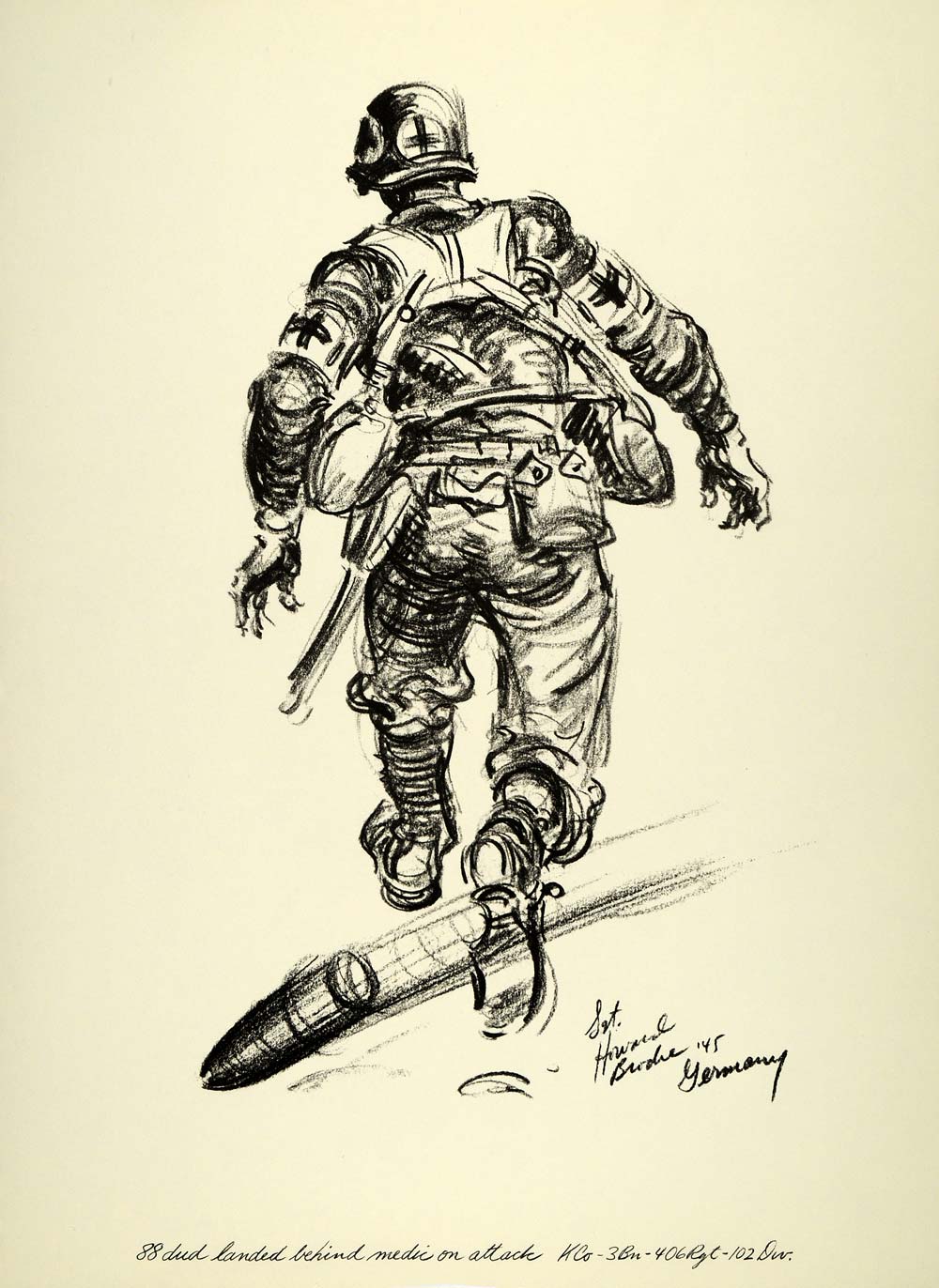 1963 Print Howard Brodie WWII Art Medic Oliver Poythress Soldier Dud 88 Mortar