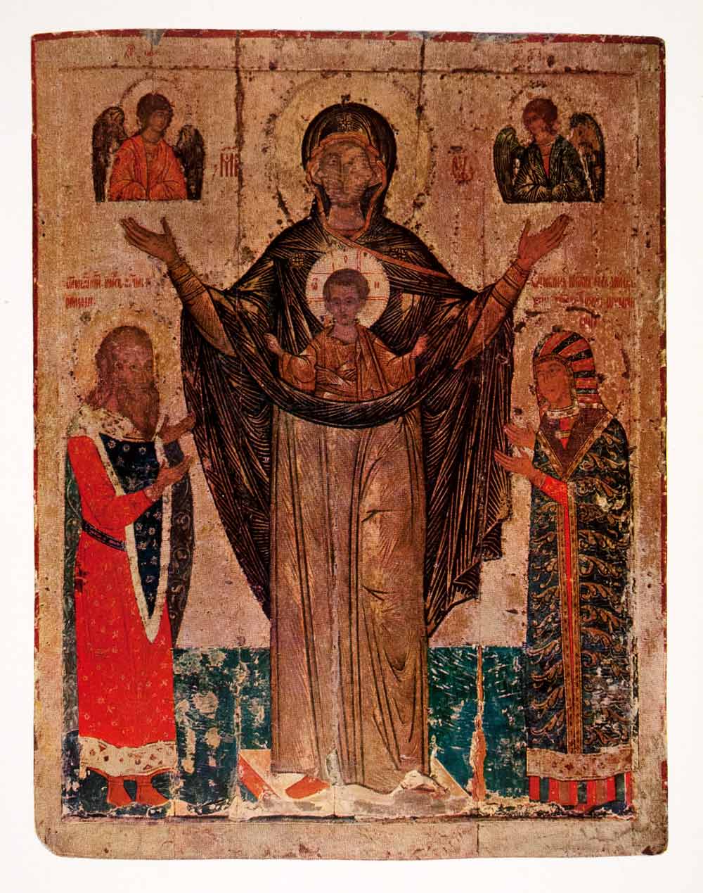 This is an original 1963 color with metallic ink print of the Oranta Ili Panagija Velikaja, also known as The Orans or the Great Panhagia located in the Home Museum of the Pskov Area, Pskov in Russia.