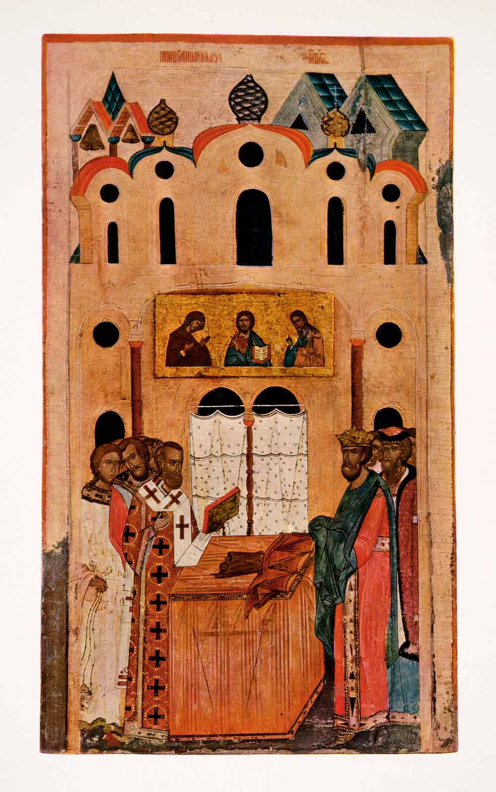 This is an original 1963 color with metallic ink print of the Rizpolozenie Bogomateri, also known as the Laying Down of the Garment of the Virgin located in the Nizhny Novgorod State Art Museum in the city of Nizhny Novgorod in Russia.