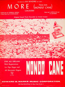 This is an original 1963 piece of sheet music. Words by Norman Newell and music by Riz Ortolani and Nino Oliviero. Copyright © 1963 by Edward B. Marks Music Corp. The theme song from the 1962 Italian movie "Mondo Cane."