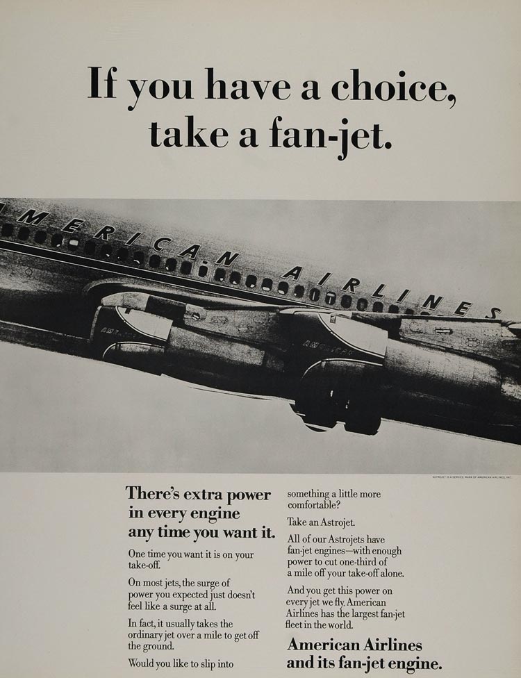 This is an original 1964 black and white print ad for American Airlines and its fan-jet engine.
