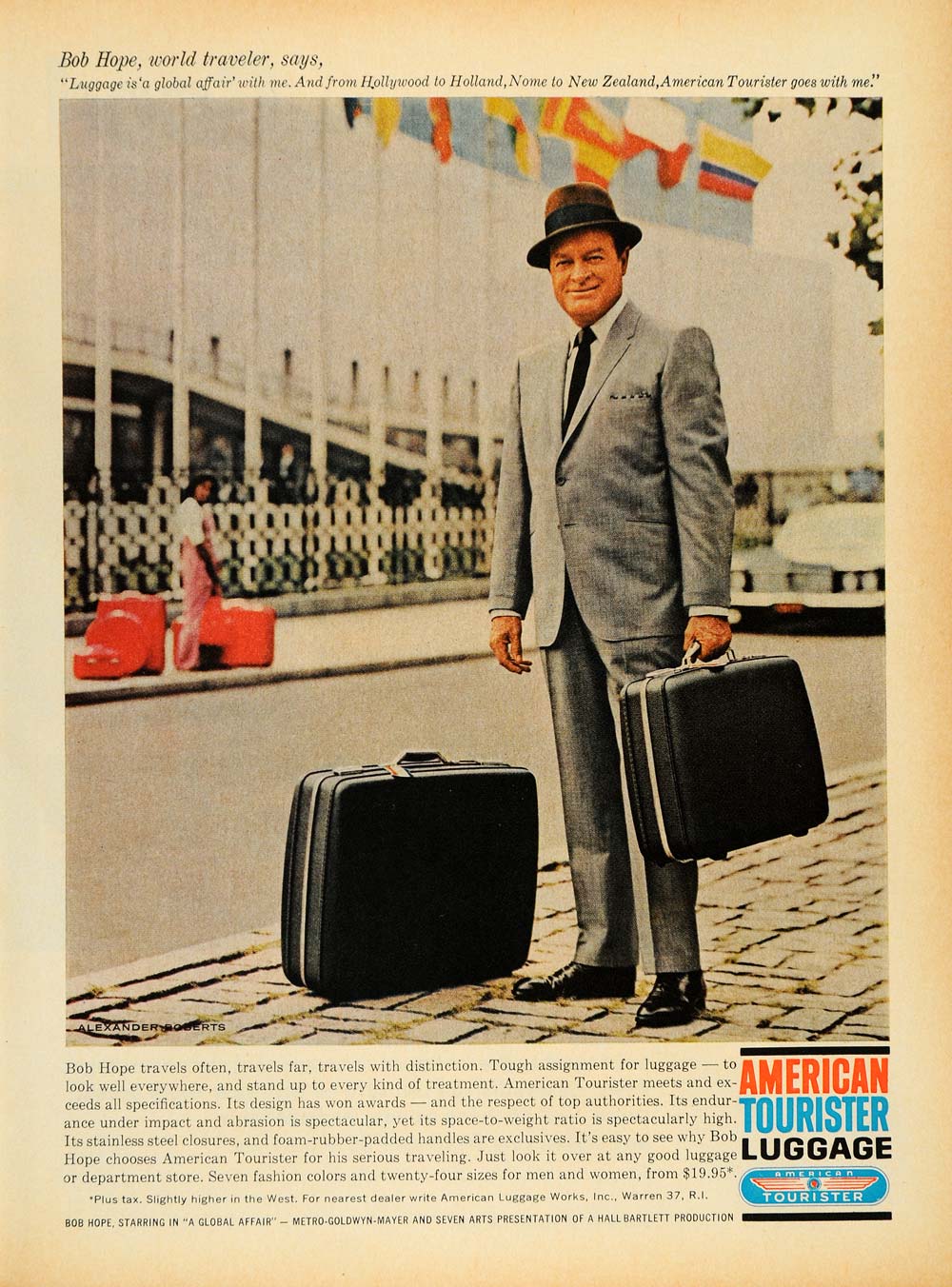 This is an original 1964 color print ad for American Tourister Luggage, featuring Bob Hope. Photography by Alexander Roberts.