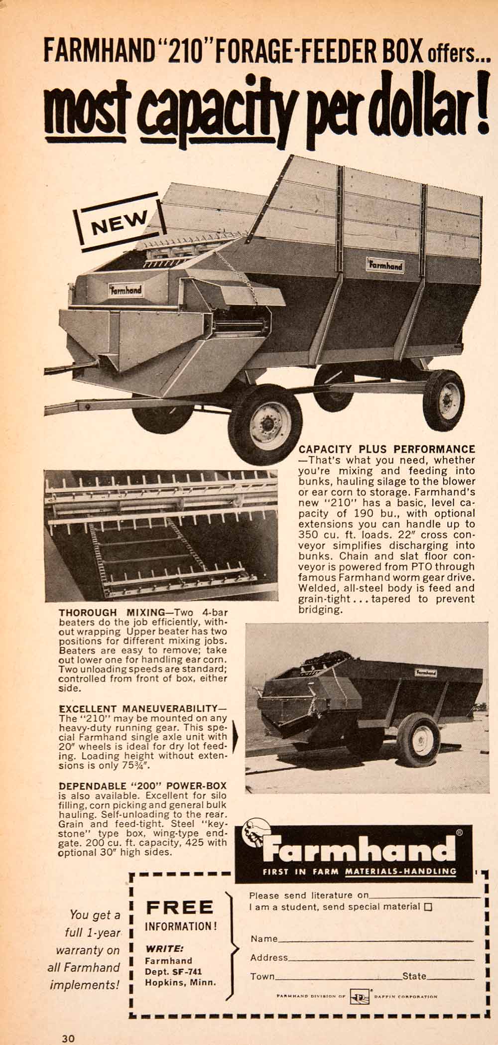 This is an original 1964 black and white print ad for "Farmhand Farming Equipment," featuring the Farmhand '210' Forage-Feeder Box.