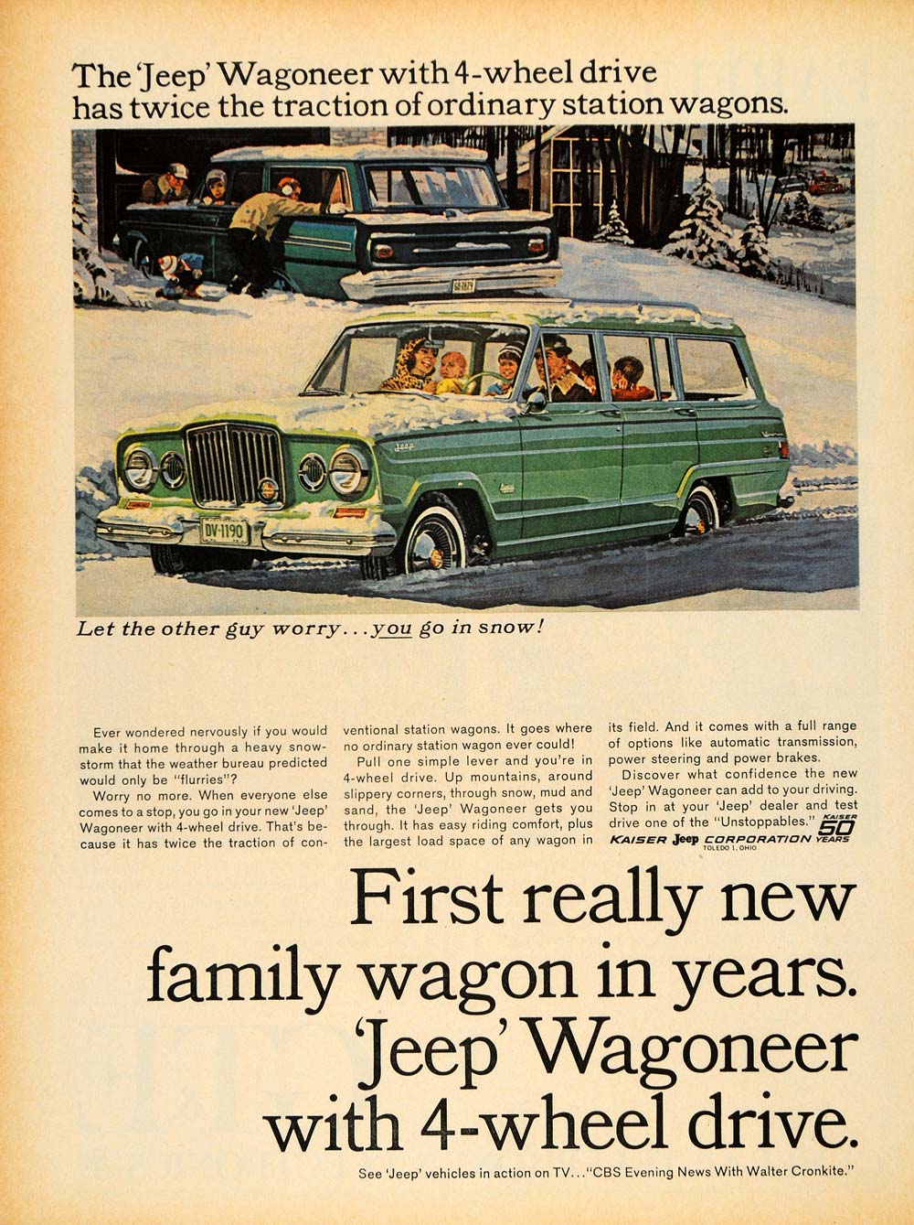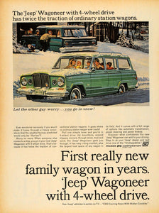 This is an original 1964 color print ad for the Kaiser Jeep Wagoneer with four-wheel drive.