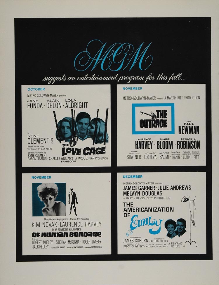 This is an original 1964 color print ad for the Metro-Goldyn-Mayer Production Company. The ad mentions four movies: "The Love Cage", "The Outrage", "Of Human Bondage", and The Americanization of Emily".