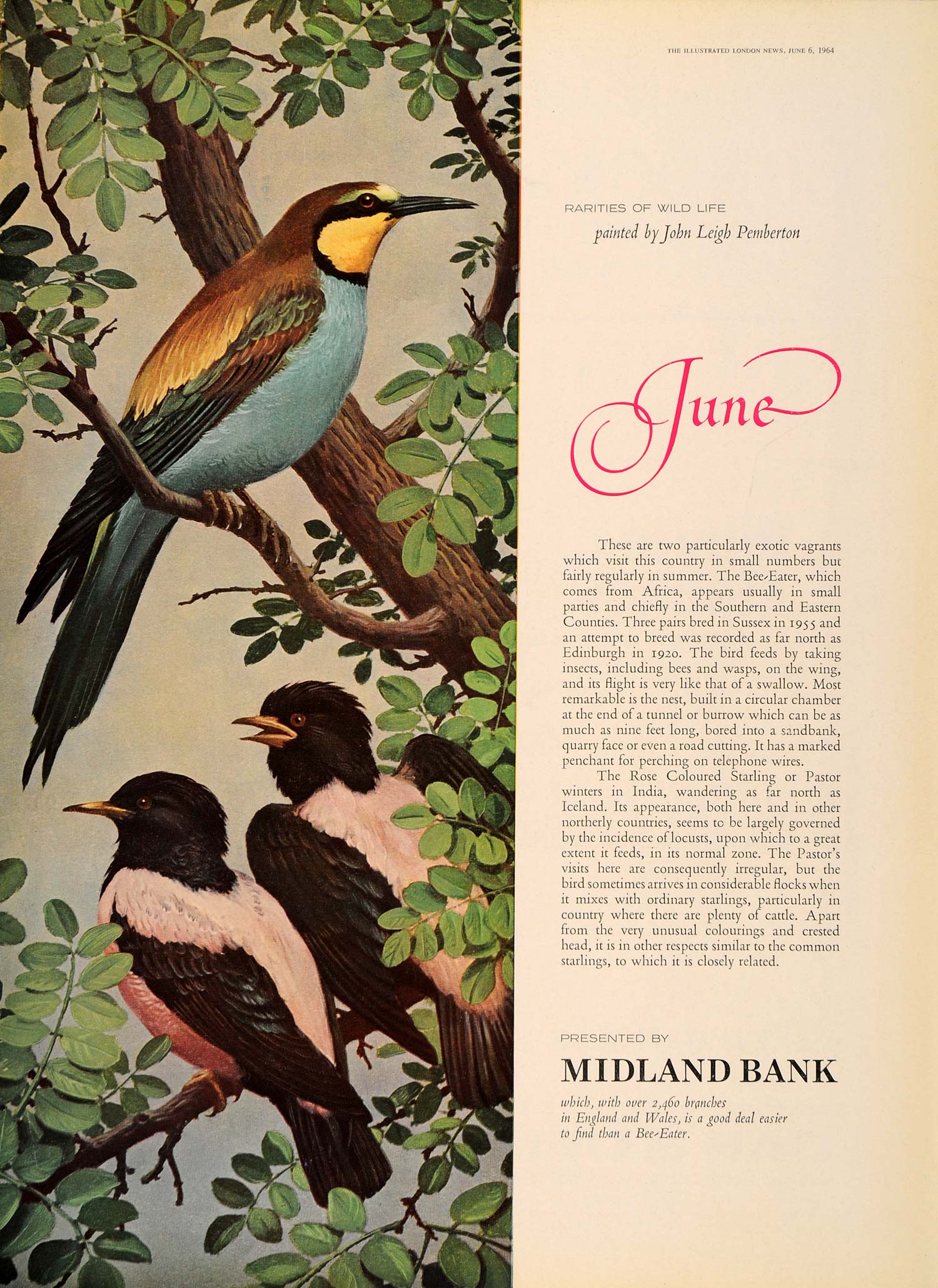 This is an original 1964 color print ad for the Midland Bank of England and Wales which features two birds: the Bee-eater; and the Rosy Starling or Rose-Colored Starling or Pastor. In the 1960's the Bank ran an ad campaign series, the "Rarities of Wild Life," with paintings of artist John Leigh-Pemberton. The Bank is now part of HSBC Holdings.