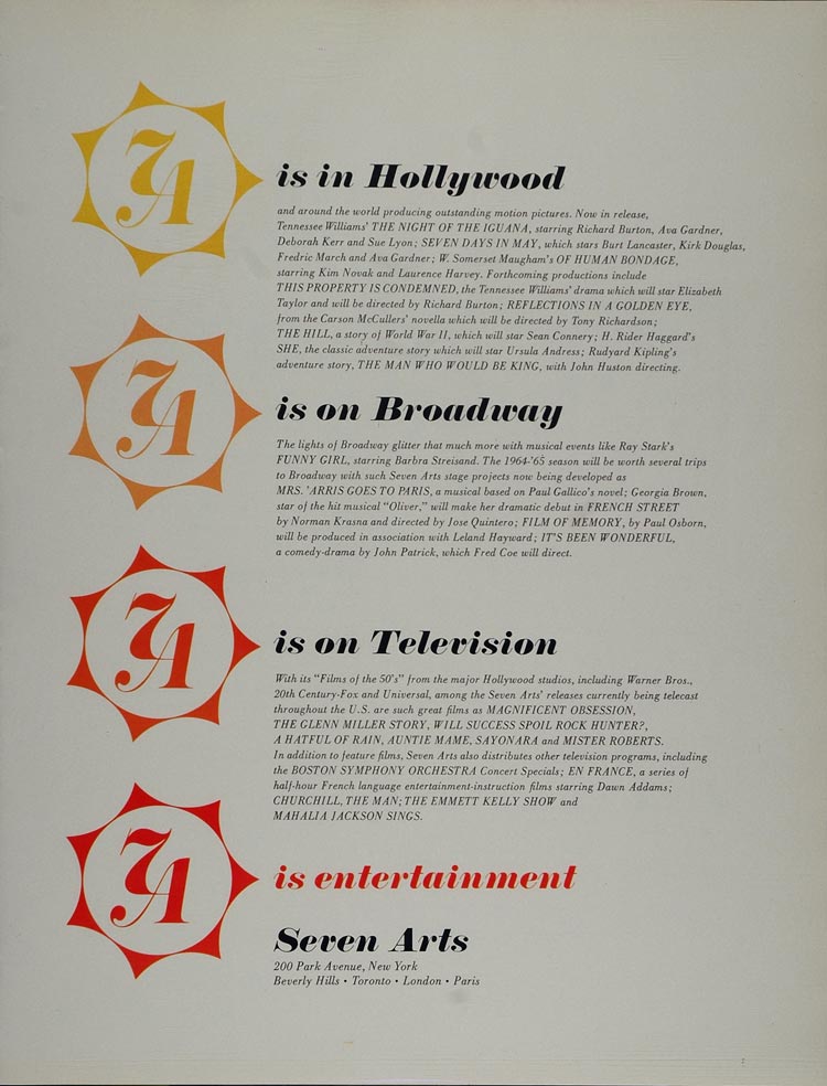This is an original 1964 color print ad for Seven Arts Production Company. Seven Arts produced Hollywood movies, Broadway musicals and Television shows.