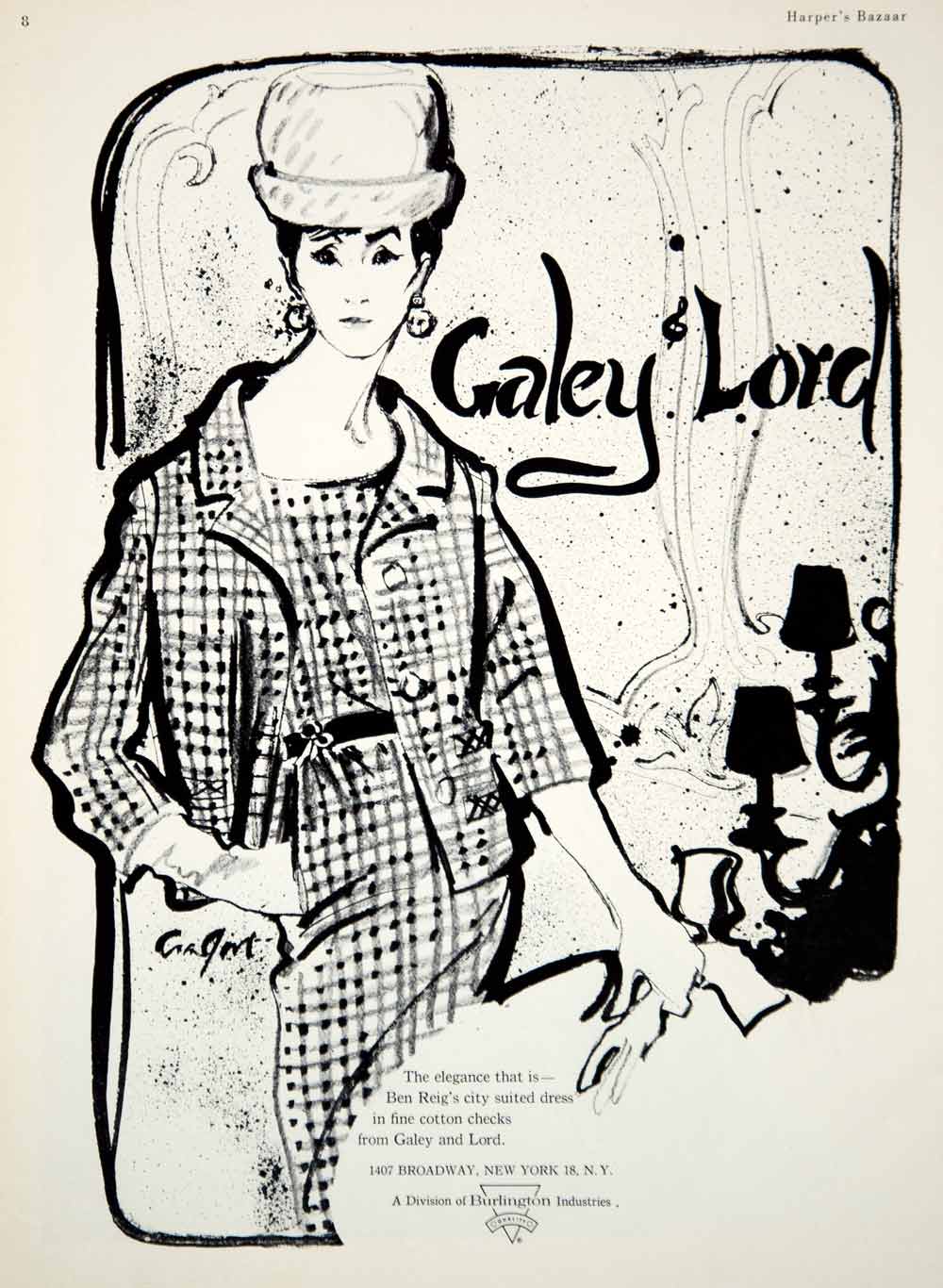 This is an original 1964 black and white print ad for an elegant suited dress by Ben Reig in cotton checked fabric from Galey & Lord.