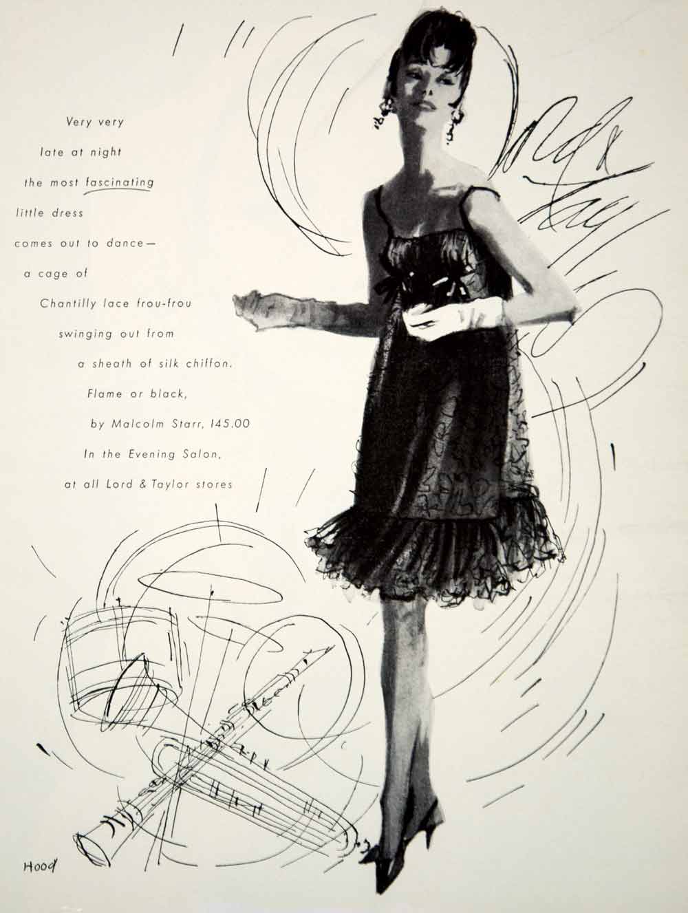 This is an original 1964 black and white print ad for a little black dress of Chantilly lace over a sheath of silk chiffon, designed by Malcolm Starr, and available in the Evening Salon at all Lord & Taylor stores.