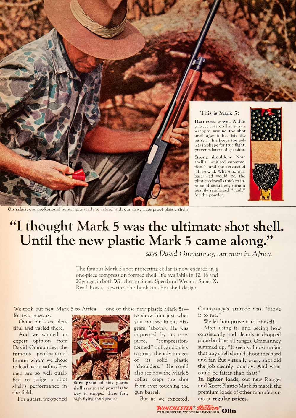 This is an original 1964 color print ad for the Mark 5 shot shell from the Winchester-Western Division of Olin. Shown in the illustration is David Ommanney, who was on a safari in Africa.