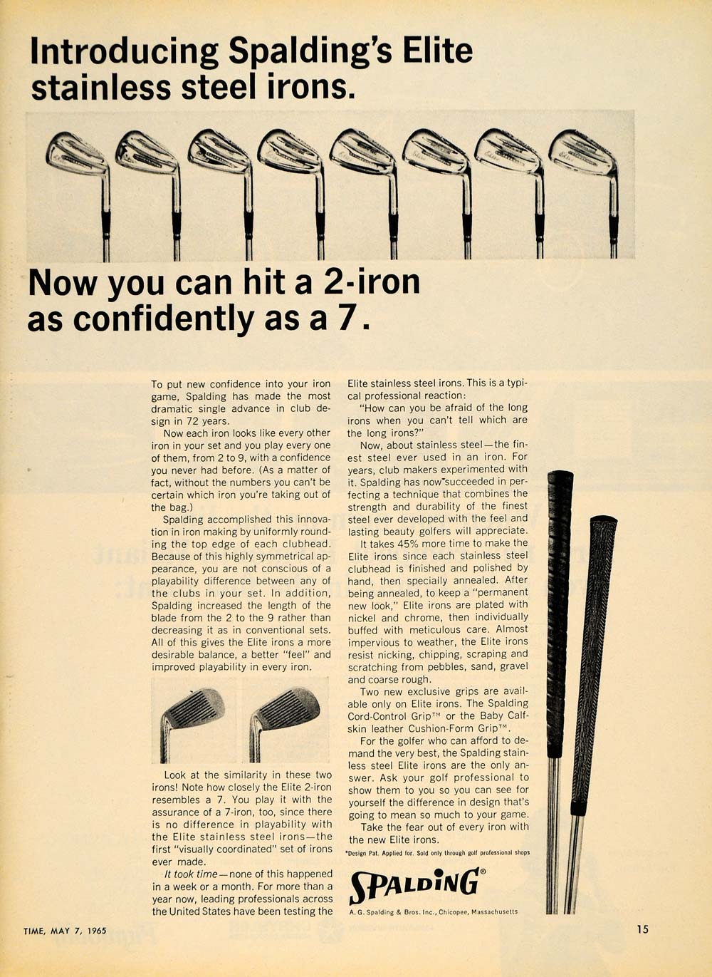 This is an original 1965 black and white print ad for the Spalding's Elite Clubs from A. G. Spalding & Bros. Incorporation located in Chicopee, Massachusetts.