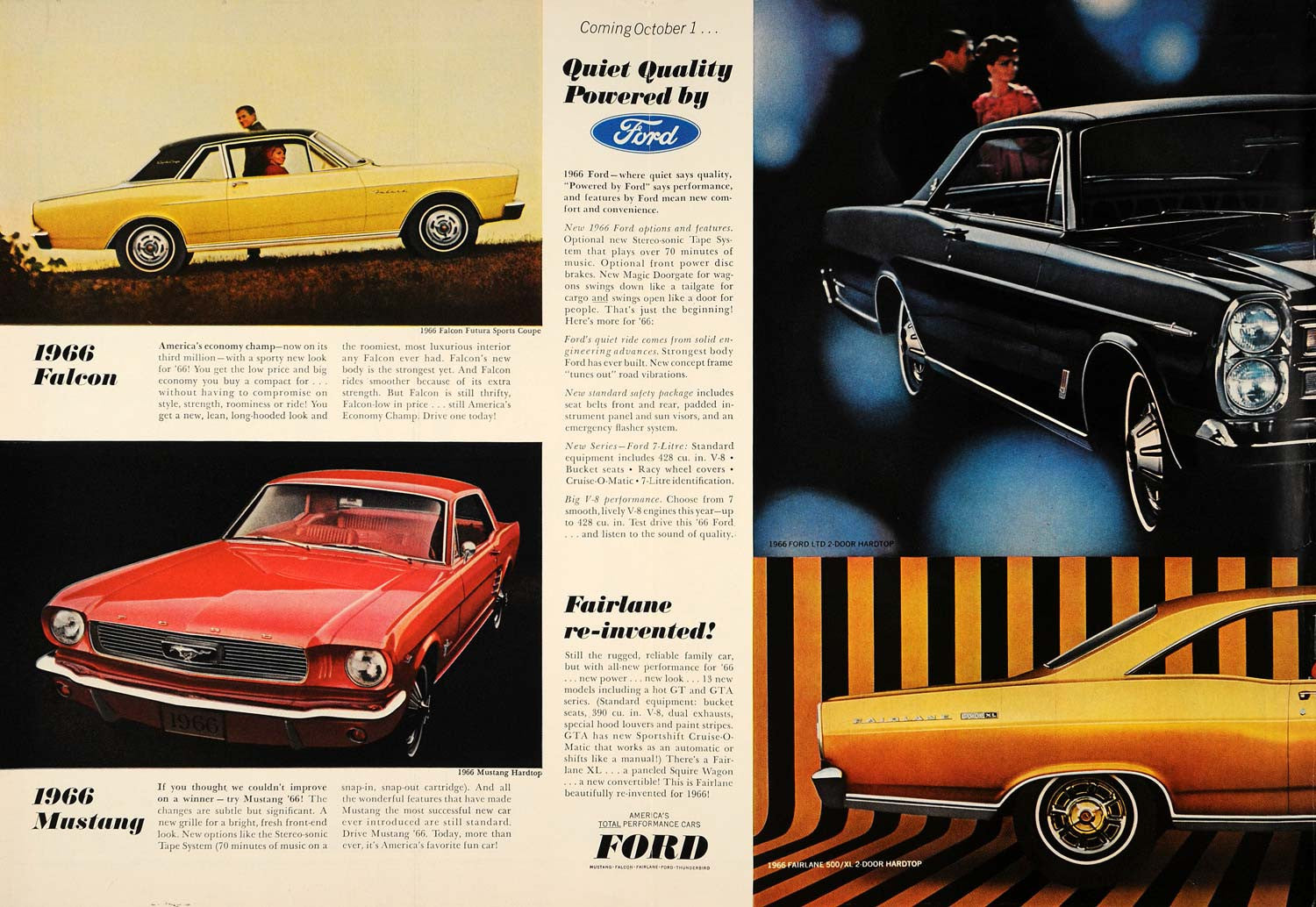 This is an original 1965 color double-page print ad for the Ford Motor Company promoting the 1966 Falcon Futura Sports Coupe, Mustang Hardtop, Ford LTD 2-door Hardtop and Fairlane 500/XL 2-Door Hardtop automobiles.