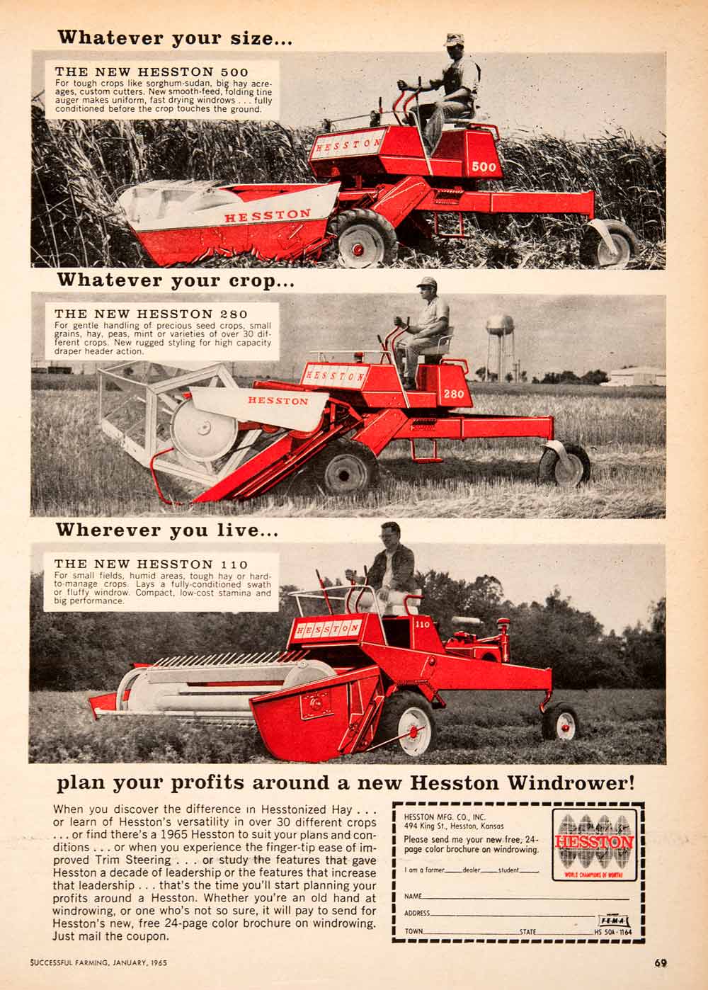 This is an original 1965 two-color print ad for various farming instruments from the Hesston Manufacturing Company of Hesston, Kansas.