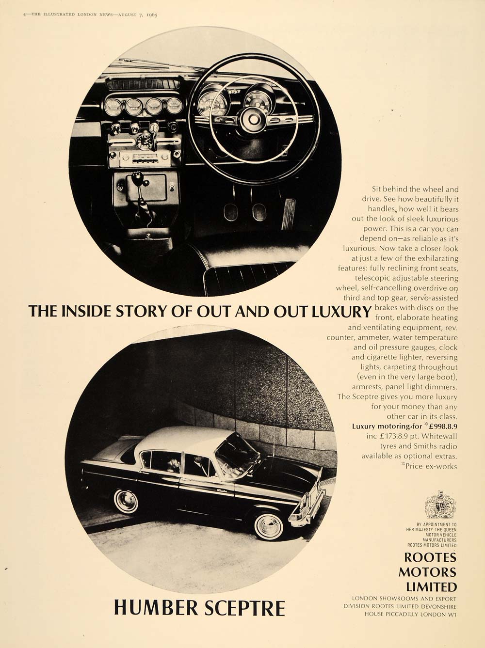 This is an original 1965 black and white print ad for the Humbler Sceptre from Rootes Motors Ltd.