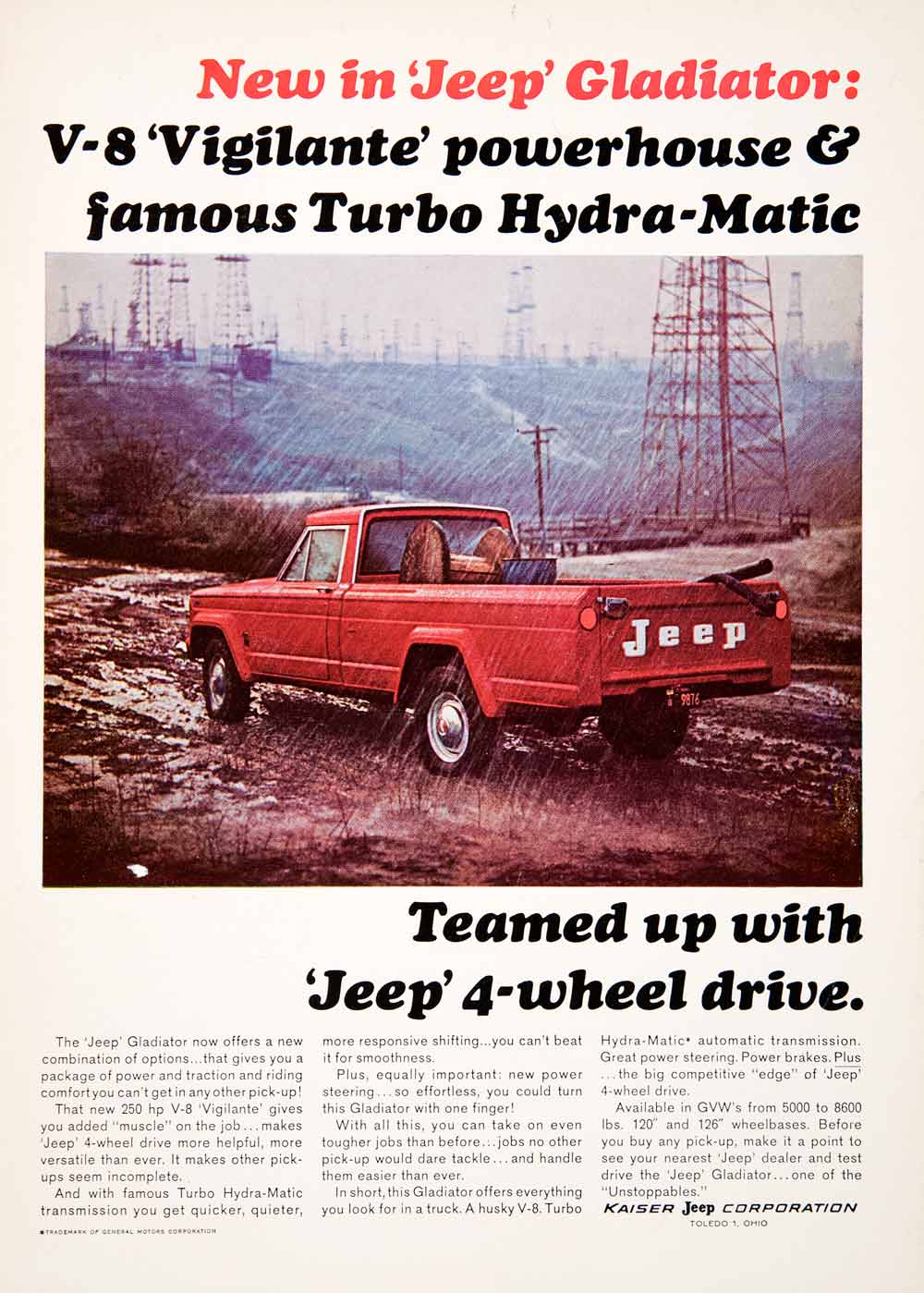 This is an original 1965 color print ad for the "Jeep Gladiator," pickup truck.
