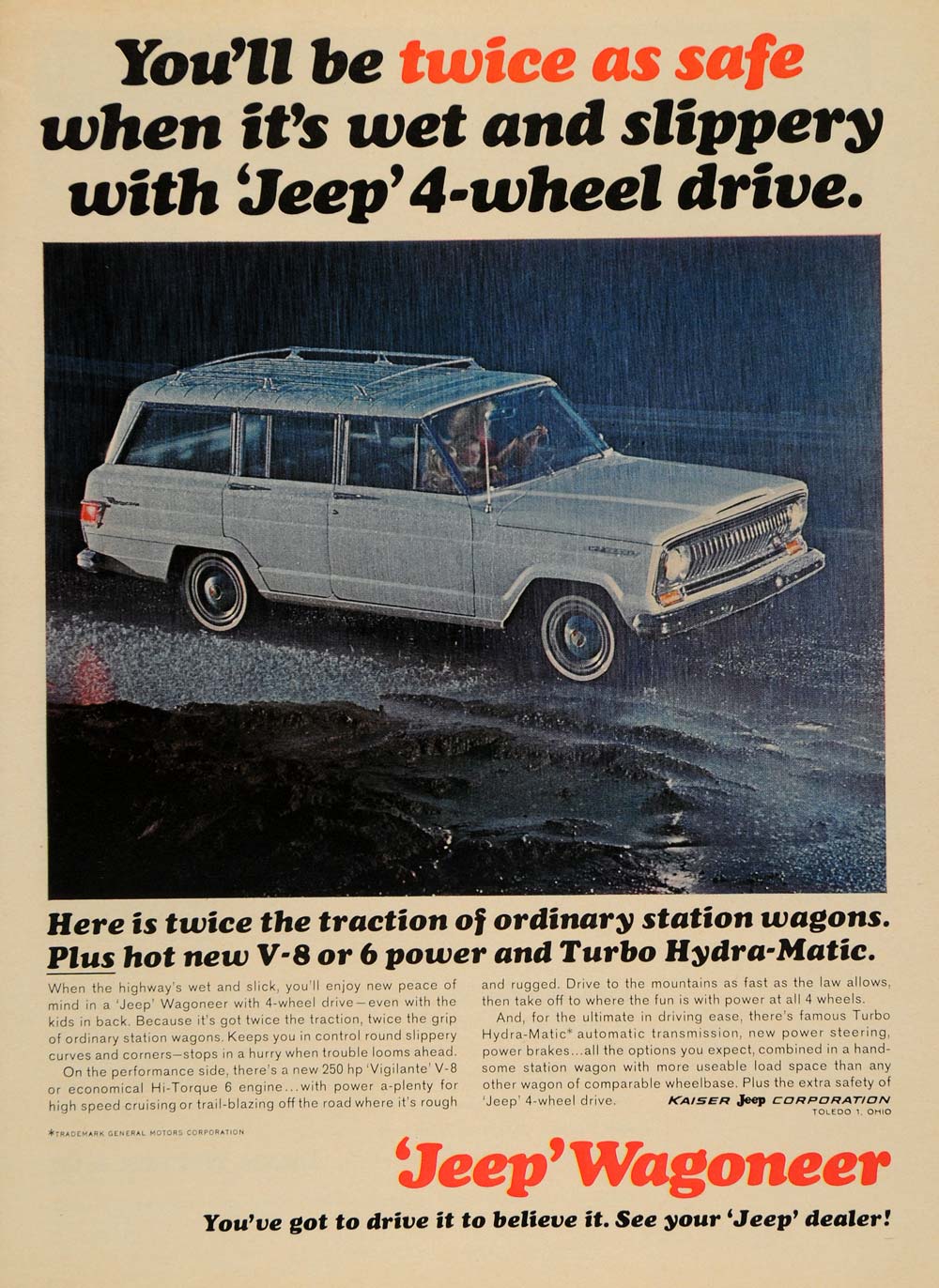 This is an original 1965 color print ad for the Jeep Wagoneer from Kaiser Jeep Corporation located in Toledo, Ohio.
