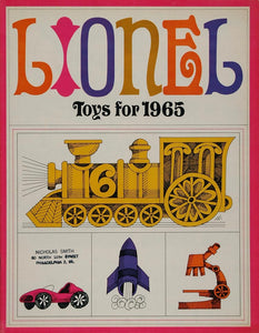 This is an original 1965 color print catalog for Lionel toys including: model electric train sets ("027 Train Outfits; 'O" and "HO Gauge Train Outfits; Locomotives; Rolling Stock: track and accessories) ; Racing Car Sets; Science Sets and Phonographs (including the Mickey Mouse Party Maker, and the Mickey Mouse Phonograph Sets); the Helios 21--the remote controlled spaceship of the 21st century; and the Lionel U-Drive Boat. This 40 page catalog is in excellent condition and would be a wonderful print item for the collector of these Lionel toys!