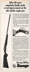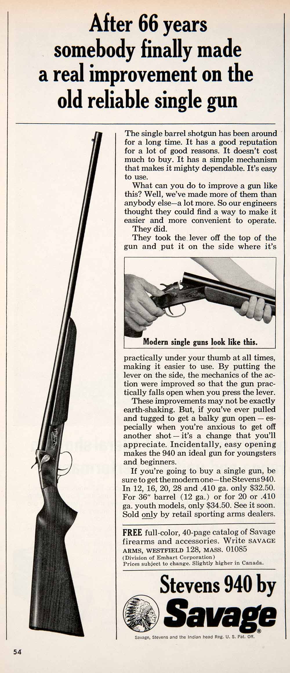 This is an original 1965 black and white print ad for the Stevens 940 single barrel shotgun, a product by Savage Arms of Westfield, Massachusetts. Savage Arms was a division of the Emhart Corporation.