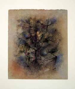 This is an original 1965 color photolithograph of a c.1950 watercolor painting by Wols, the pseudonym of artist, Alfred Otto Wolfgang Schulze. Please note that the dimensions given are for the printed area and border. The print with border is mounted in a white slipcover frame that measures approx. 11" X 12.5" which is not visible on the digital image.