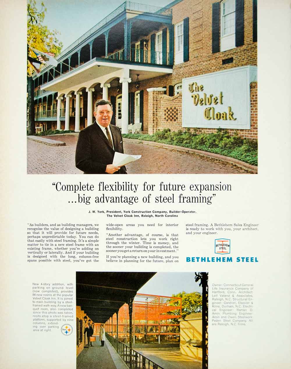 This is an original 1966 color print ad for Bethlehem Steel framing used in the construction of a 4-story addition to The Velvet Cloak Inn in Raleigh, North Carolina. The ad includes an image of J. W. York, President, York Construction, Builder-Operator in front of this historic hotel.