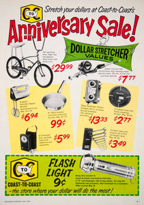 This is an original 1966 color print ad for Coast-to-Coast's Anniversary Sale. Shown in the advertisement is a Teflon pan, a Hamilton Beach Mixette, a transistor portable radio, a plastic hose, a wrench set, a weed destroyer fencer, a Zebco fishing rod, and a high rise handlebar bicycle.
