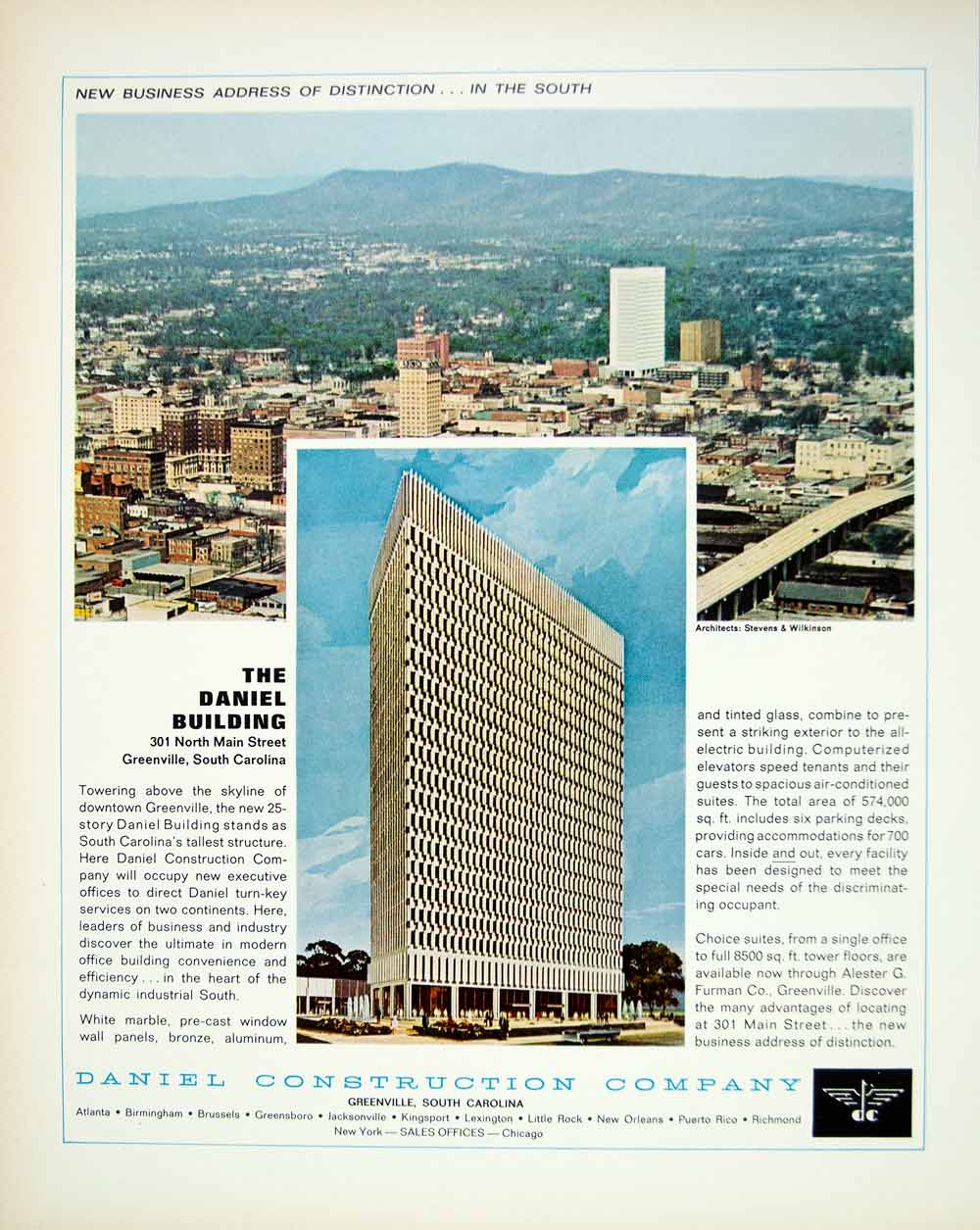 This is an original 1966 color print ad for the Daniel Construction Company of Greenville, South Carolina featuring a view of downtown Greenville and the office suites available in the new Daniel Building at 301 North Main Street. Architects: Stevens & Wilkinson.