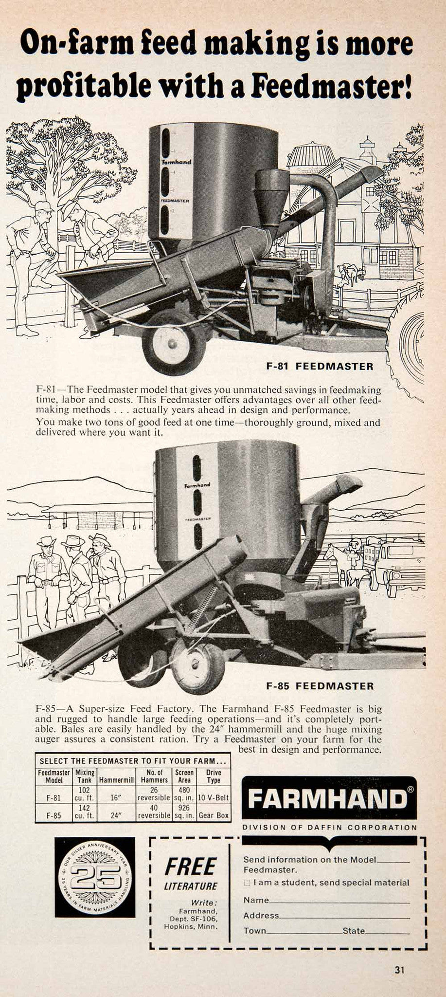 This is an original 1966 black and white print ad for the F-81 and F-85 Feedmaster by Farmhand, a division of the Daffin Corporation of Hopkins, Minnesota.