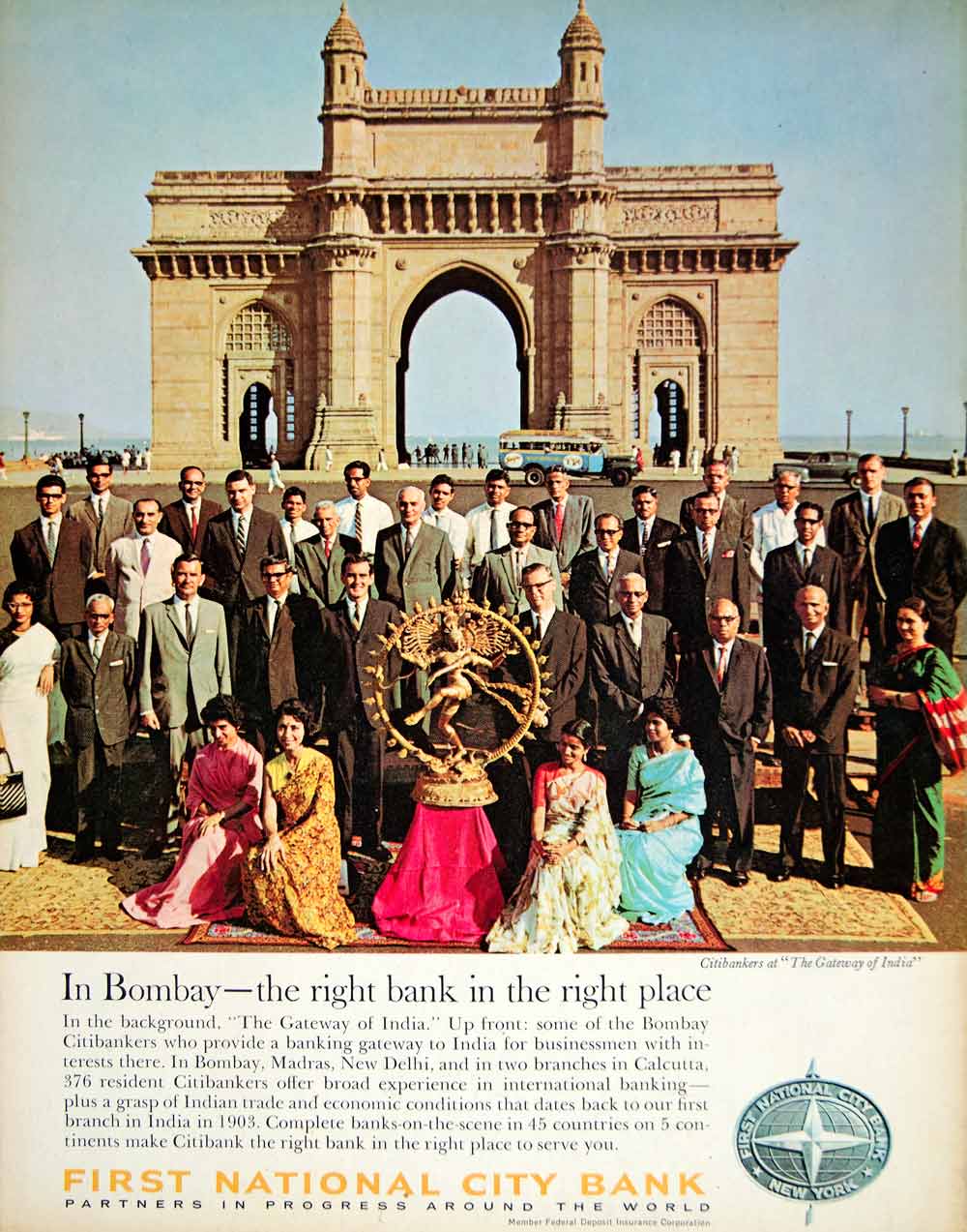 This is an original 1966 color print ad for the First National City Bank featuring the Bombay (Mumbai)Citibank staff at the Gateway of India monument in Bombay (Mumbai), India.