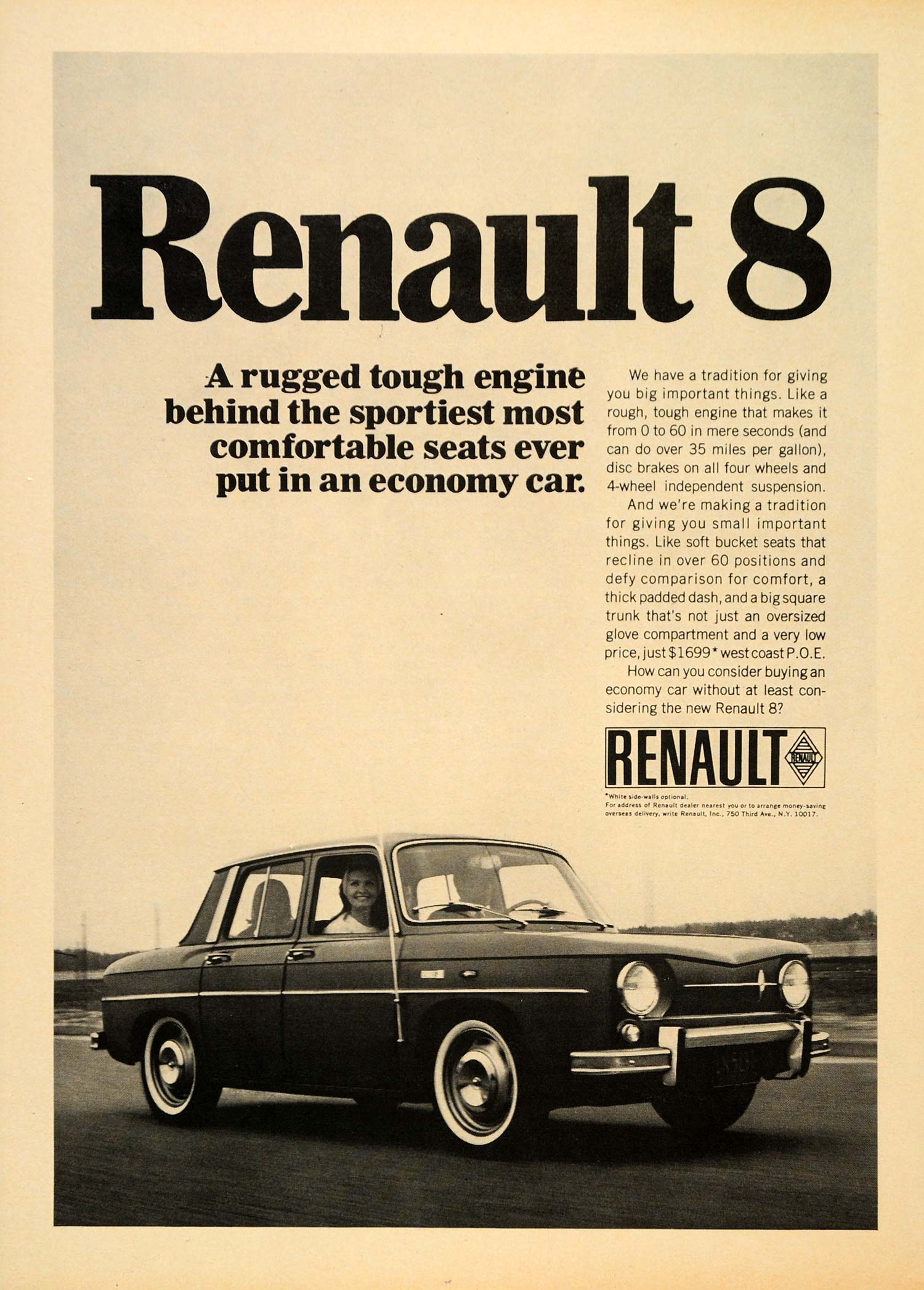 This is an original 1966 black and white print ad for the Renault 8 automobile from Renault Incorporation located at 750 Third Avenue, New York.