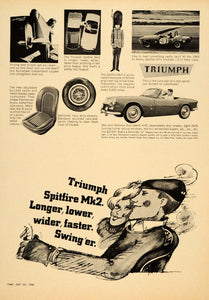 This is an original 1966 black and white print ad for the Triumph Spitfire Mk2 automobile.