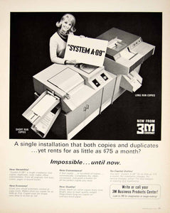 This is an original 1966 black and white print ad for the System A-09 short and long run copier and duplicator from 3M.