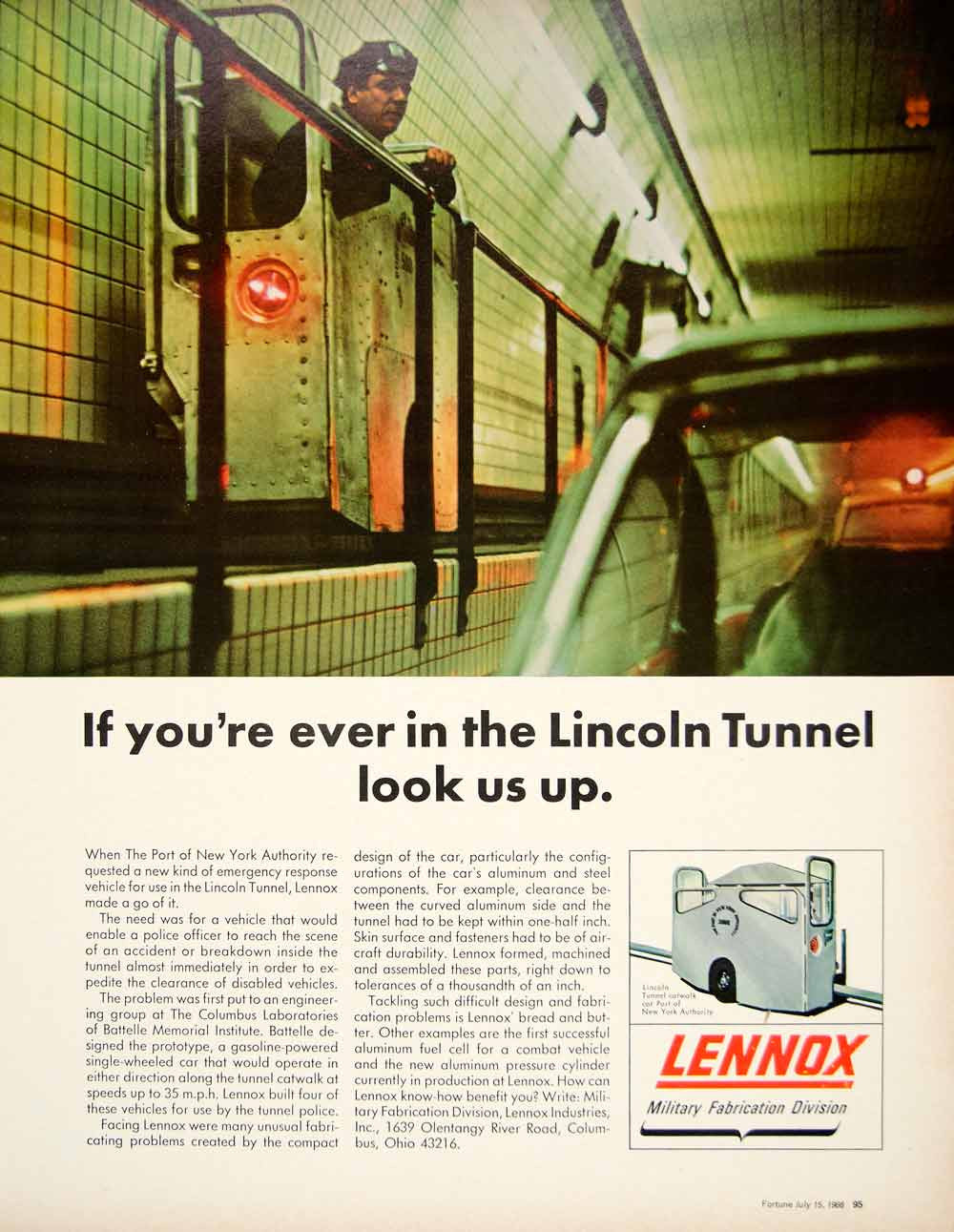 This is an original 1966 color print ad from the Lennox Military Fabrication Division of Columbus, Ohio, manufacturer of the Lincoln Tunnel catwalk car used by the tunnel police to handle emergencies in the tunnel.