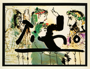 This is an original 1966 hand-mounted color print by Pablo Picasso. Cramer 134. This original print is from the final portfolio of the three-volume series "Secrets d'alcove d'un atelier" which was an important group of Picasso monographs by Helene Parmelin. Parmelin was allowed "intimate" access to Picasso's studio when he was an artist in his mid-80's, examining the works of art of that Picasso refused to sell because they held particular meaning to him. This is why most of the works offered from this collection are not named. It is a true exploration of achievement in the latter part of his career.