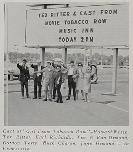 This is an original 1966 halftone print of Tex Ritter and the cast of the movie "Girl from Tobacco Road" including Howard White, Earl Richards, Tim and Ron Ormond, Gordon Terry, Ruth Charon, and June Ormond in Evansville, (Indiana?)