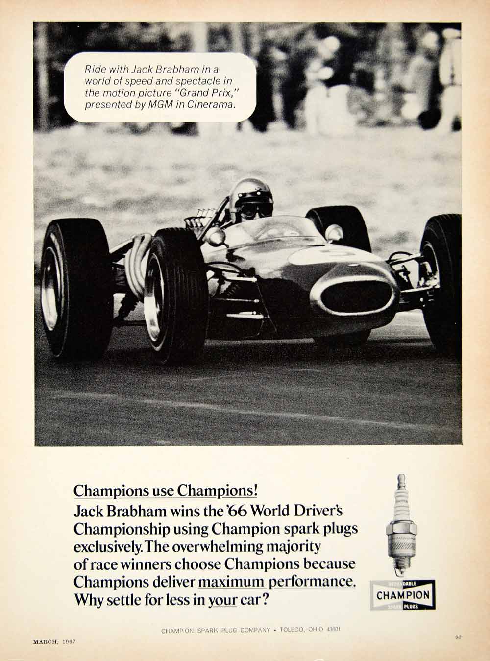 This is an original 1967 black and white print ad for Champion brand spark plugs that were used and endorsed by race car driver Jack Brabham, the winner of the 1966 World Driver's Championship.